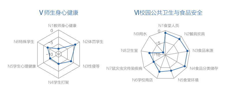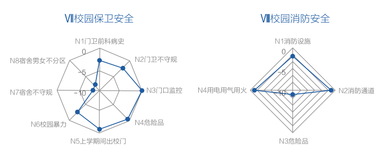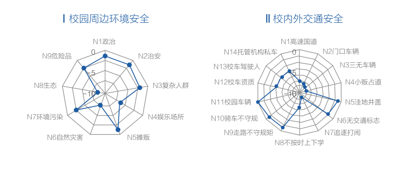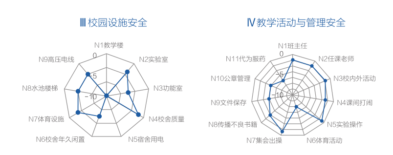 测评方式采取给定分值范围、填写者根据实际情况自主打分的形式,每一测评指标得分由应对措施、防范教育、监管制度以及安全隐患得分四项之和,每一方面内容得分由该项内容下所有指标得分之和除以该项内容下总指标个数得出。最后,校园安全十个方面的得分结果汇总,以雷达图的形式呈现,分值越大代表安全等级越高,反之越低。