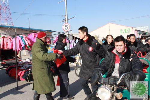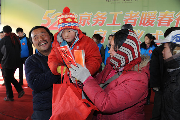 泛海集团助理总裁李亦明向务工者发放暖春礼品。