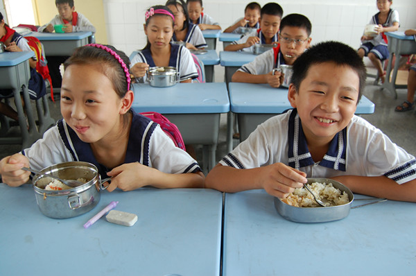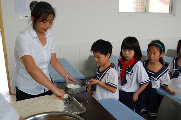 新利小学的小朋友在排队等候老师分发爱心午餐