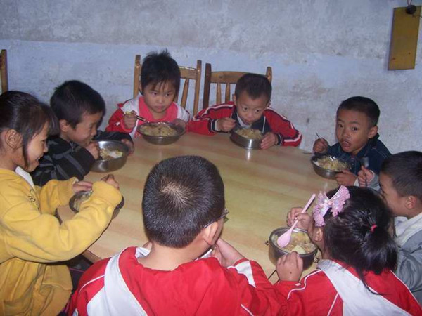 土门小学的小朋友们天真无邪的享用着爱心午餐