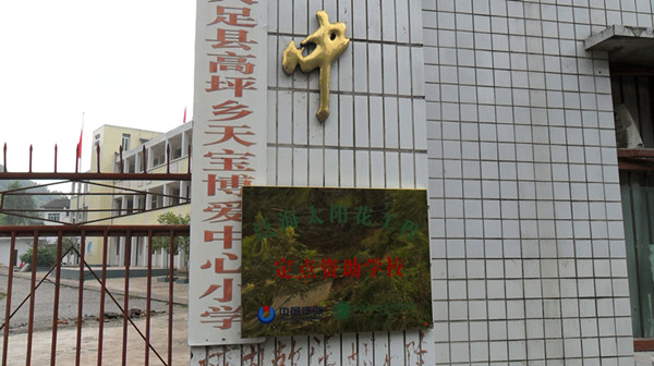 图为天宝小学悬挂资助牌匾,天宝小学是泛海太阳花工程的定点资助学校