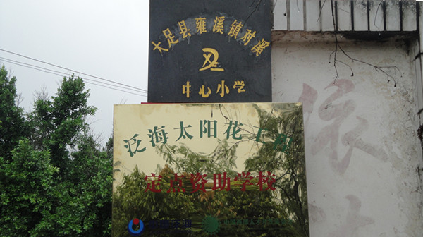 图为对溪小学悬挂资助牌匾,对溪小学是泛海太阳花工程的定点资助学校