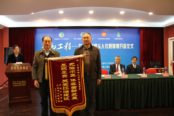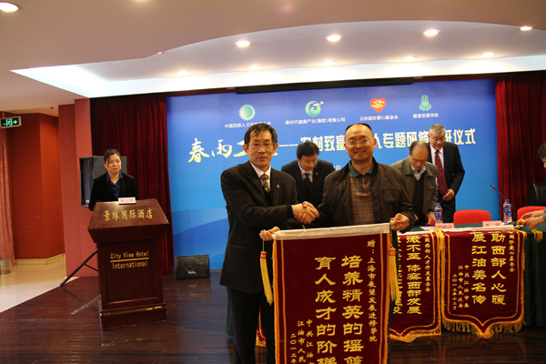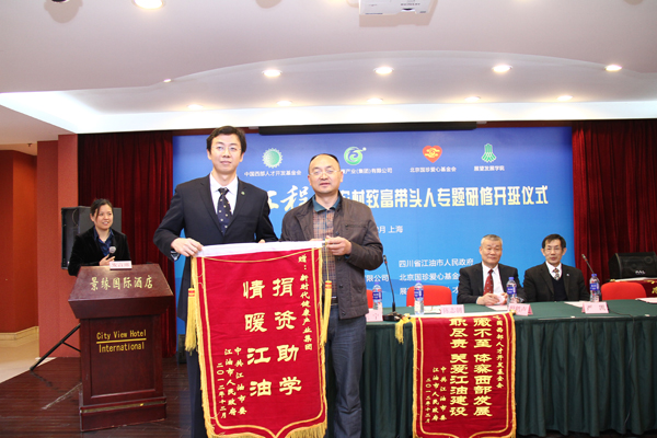 王涌代表四川省江油市人民政府向中国西部人才开发基金会赠送锦旗。