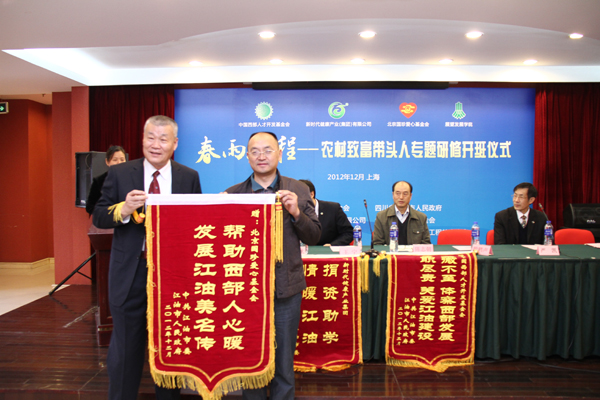 王涌代表四川省江油市人民政府向上海市展望发展进修学院赠送锦旗。