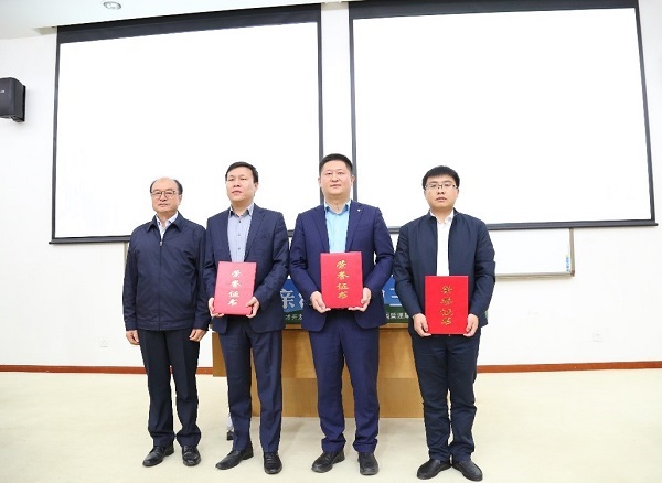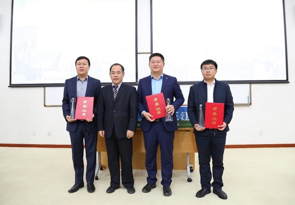 陈志朝(左一)向捐赠人代表矫超(左二)、张国华、郑杰(右一)颁发捐赠证书