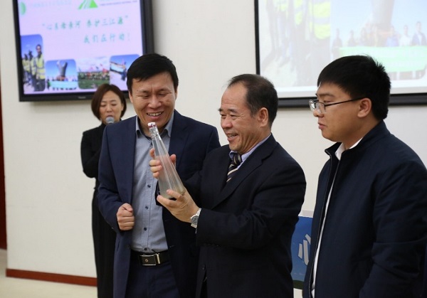 来自黄河入海口的山东日照捐赠人郑杰,特意采集了一瓶黄河入海口的河水带到了活动现场,与三江源国家公园管理局副局长任永禄带来的黄河源头圣水互赠。黄河源头圣水与入海口河水的融合,就是整条黄河。以前是水的连接,现在是爱的连接。水往下流,爱向上溯,共同祈愿黄河成为造福中华民族的“幸福河”。
